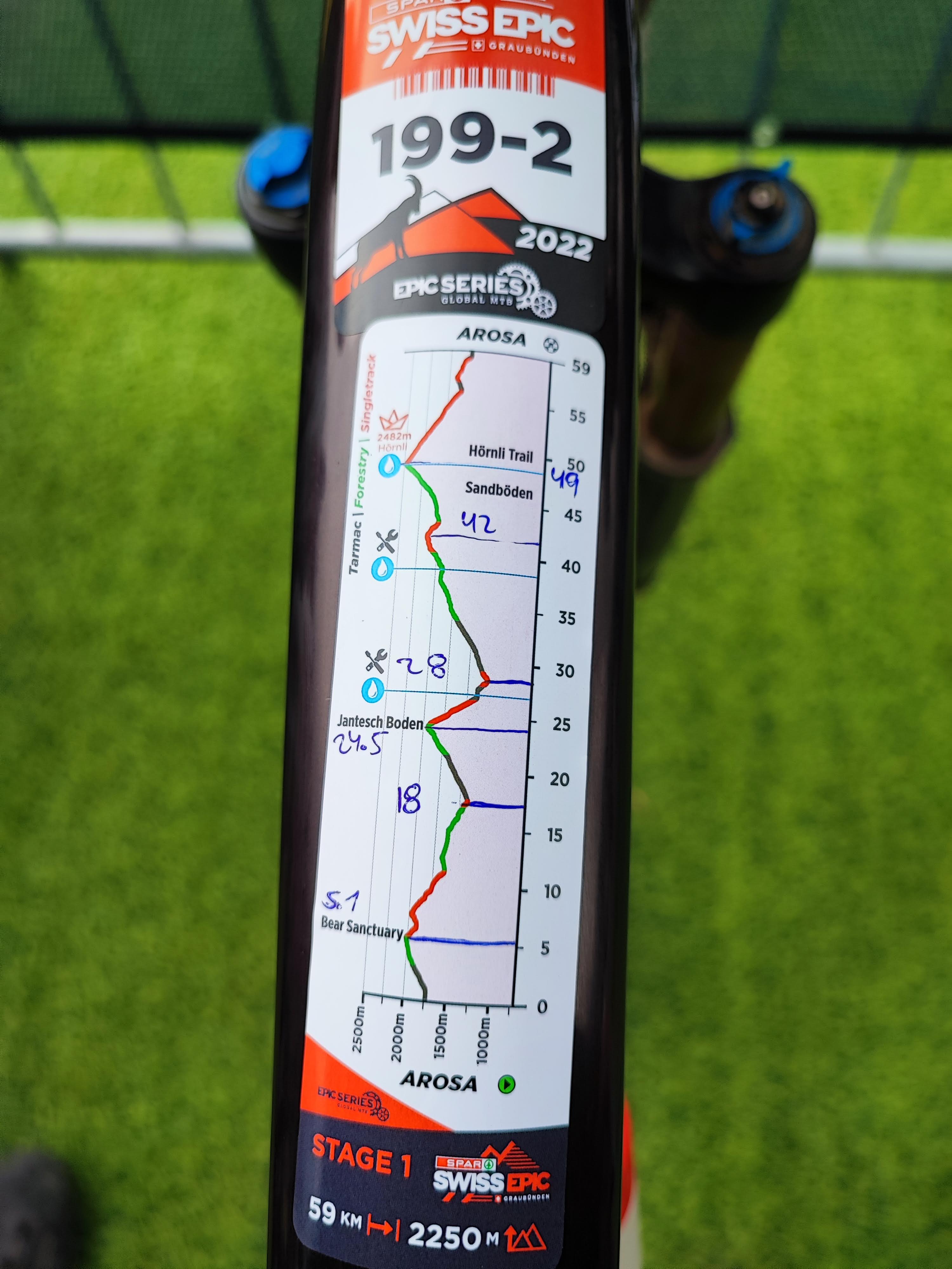 De vuelta en el hotel, preparamos la alimentación para el siguiente día: rellenar la mini botella de gel, juntar los carbohidratos líquidos, juntar los geles individuales, colocamos el número en el maillot de mañana. Mientras, analizamos el próximo desnivel, la hora de partida, los tiempos, alistamos la maleta que entregaremos para que nos devuelvan en la siguiente estación de transición. Después cenamos, volvemos a la habitación, despertador a las cinco de la mañana, y luego la gran pregunta: ¿fue suficiente toda la ingesta? ¿faltó algo? ¿debí comer más? Pienso que sí. Cierro los ojos, y parece que casi enseguida suena el despertador, lo apago. En el comedor, me empujo el desayuno entre una masa de nervios. Gel de cafeína diez minutos antes de la partida, conteo regresivo, y dele, de nuevo.